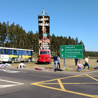 Neste ensolarado domingo, 31 de julho, O COLETIVO DE LUTAS dos Sindicatos dos de Trabalhadores em Transportes Urbanos e Rodoviários, de Passageiros e Cargas (SITTRACOL, SINTRATURB, SINDETRANSCOL, SINTTRAVALE, SINTRACARGAS e SINTRACRIL) montou a instalação DROGA DE PATRÃO na região Oeste do Estado de Santa Catarina,na BR 282, mais especificamente no Trevo do Irani, que é uma confluência rodoviária interligando os três estados da Região Sul do Brasil. Pelo lado de Santa Catarina serve de acesso para os Municípios do entorno de Chapéco, Xanxerê, Concordia, dentre outros. Para as bandas do Rio Grande do Sul serve de acesso para Erexim, Passo Fundo e Porto Alegre e para estado Parananense abre caminho para General Carneiro, Porto União, União da Vitória e Curitiba.